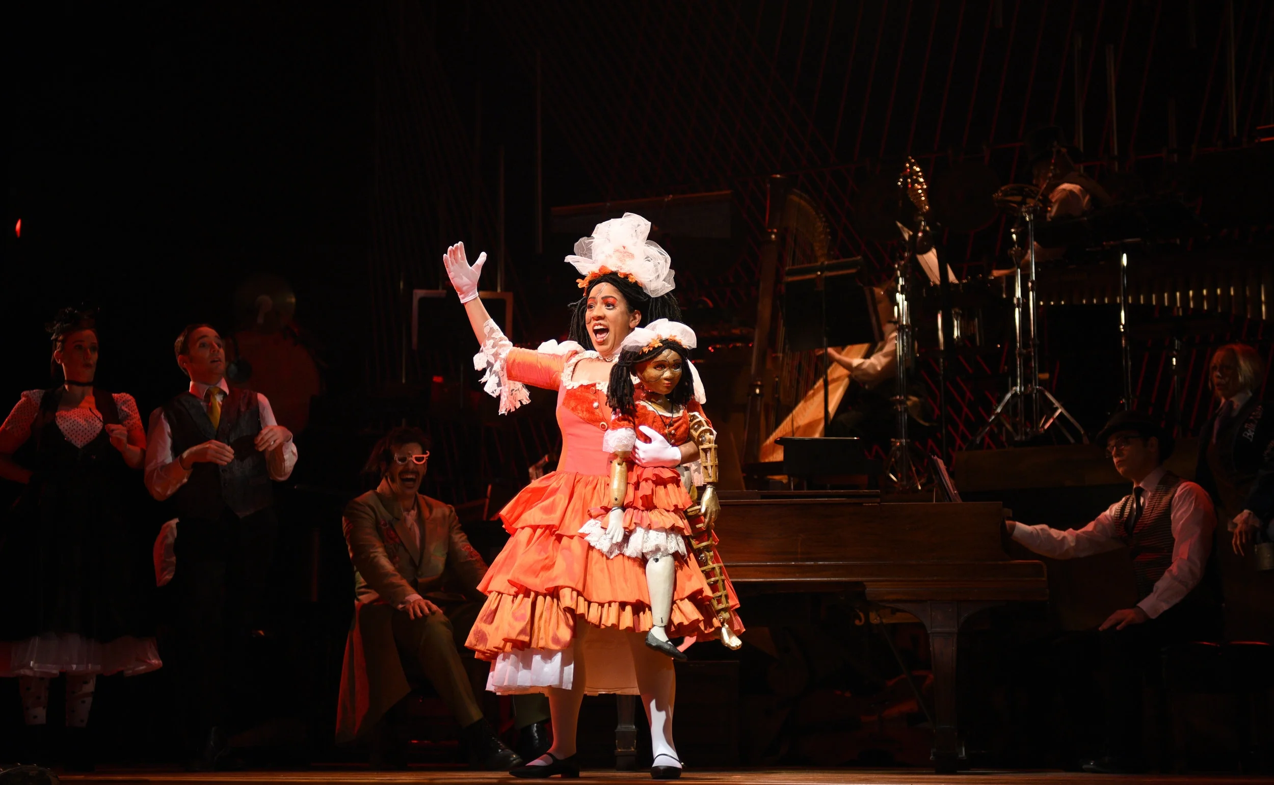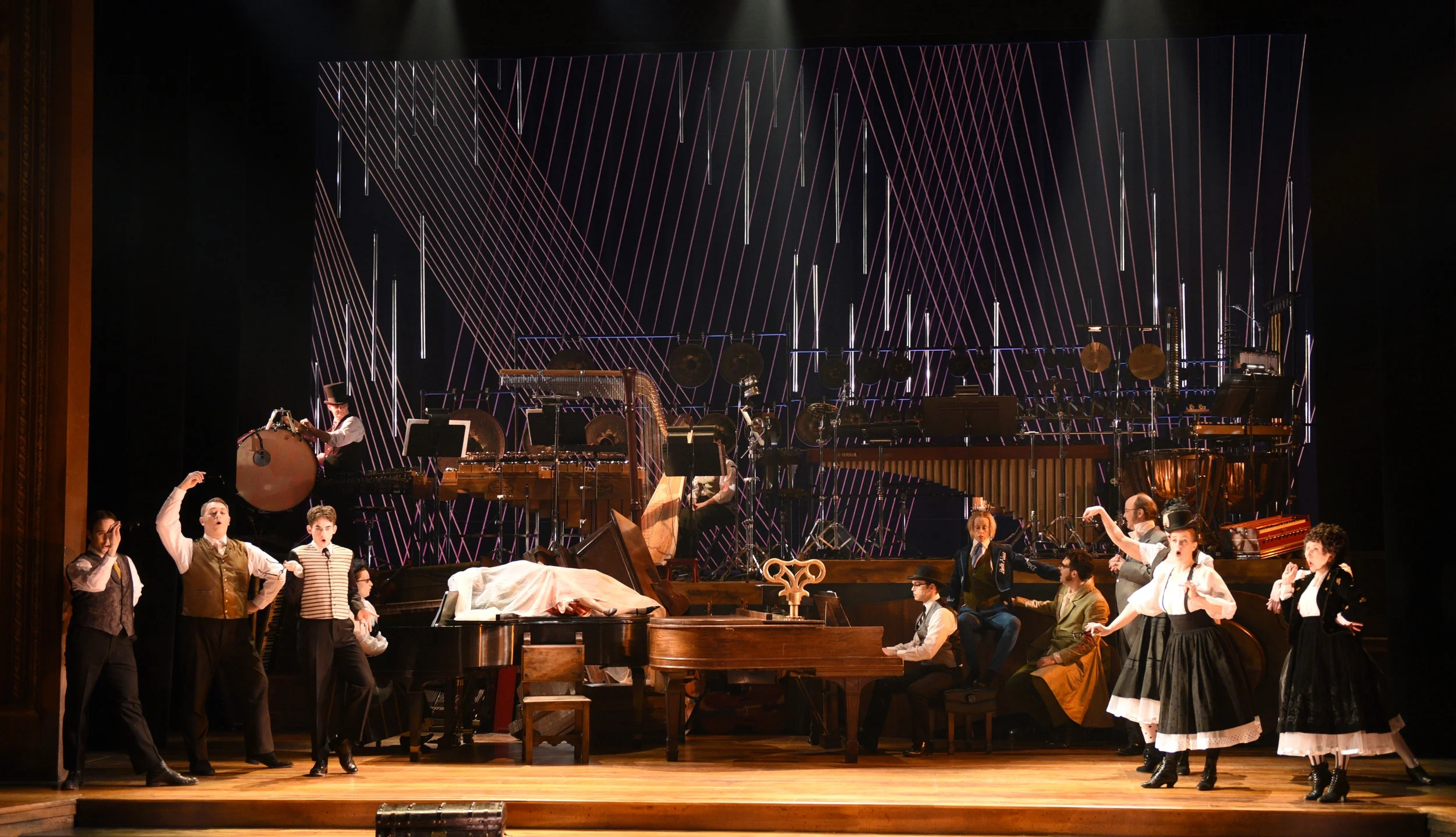 The other important "characters" in the piece were the musicians – all positioned prominently onstage – and the bold visual style of the production, brought to life by scenic designer Lisa Anne Schlenker, lighting designer Jason Fassl and costume designer Sonya Berlovitz. As if the story was caught within an enormous musical machine, the stage held functional pianos as well as those tipped on end. A platform full of countless percussion pieces towered over the action, while the strings of an enormous piano criss-crossed to form the backdrop. An oversized neck of a violin served as stairsteps, and characters floated across the stage on instrument chariots, illuminated with strings of neon lights. Fassl's shrill red washes punctuated with bright blue made the black and white clad chorus look even more like extras from a Tim Burton film.